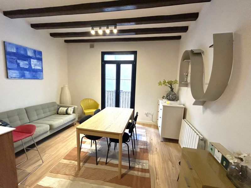 Aquest pis exterior de 42 m², disponible en règim de lloguer temporal, s'ubica als voltants del Mercat de la Boqueria, al cor de Barcelona.